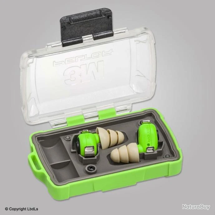 Bouchons d’oreilles PELTOR avec boîtier de rangement et de rechargement.