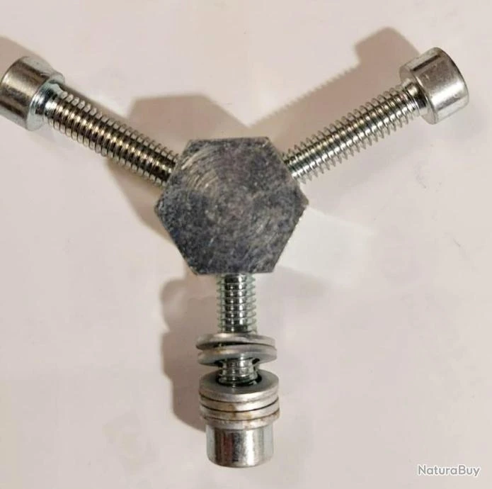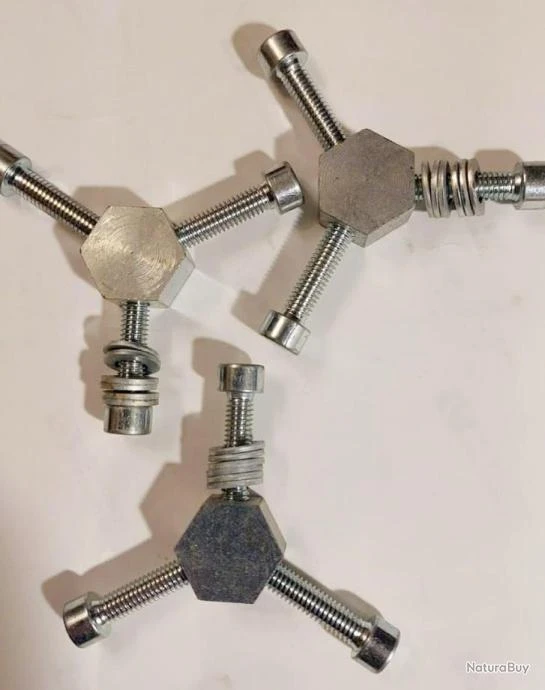 Ici, ce ne sont pas des boulons plus ou moins bien soudés… c’est une volumineuse pièce hexagonale en acier, forée, filetée et 3 solides boulons en acier, chacun muni de deux rondelles pour éviter de fendre les montants en bois,…. belle pièce, bien usinée par un chasseur qui a un atelier de mécanique de précision et qui a cassé la crosse de sa carabine à cause de la rupture de la soudure.