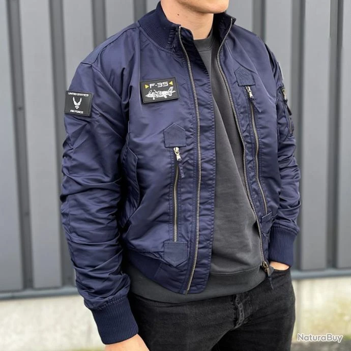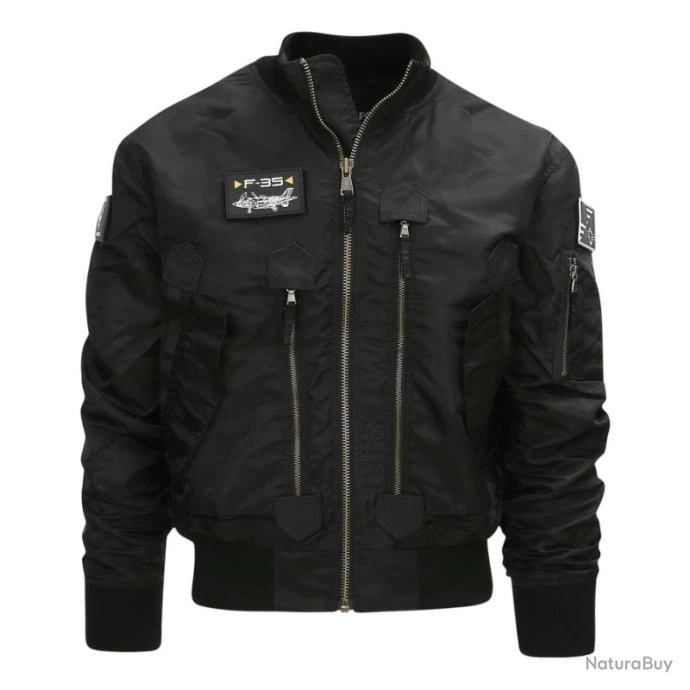 Ce blouson aviateur F-35 est équipé de patch en PVC et de divers poches avec fermetures éclair.