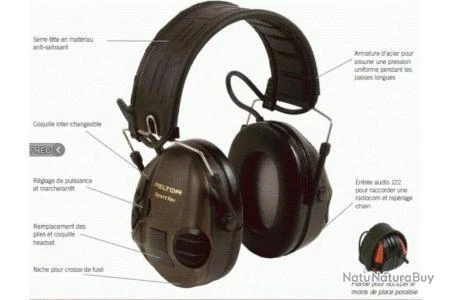 Casque Peltor, il élimine les bruits nocifs (tirs, explosions) tout en laissant passer les bruits ambiants (bruits de pas, voix lors d’une discussion…)