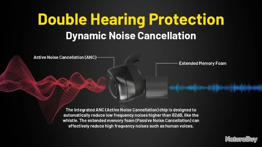 Double protection sonore : mousse à mémoire de forme et ANC.