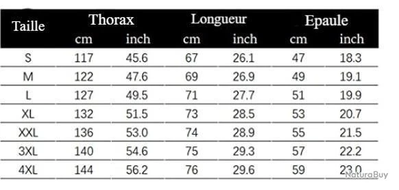 Taille : S – 4XL (Veuillez vous référer au tableau récapitulatif)