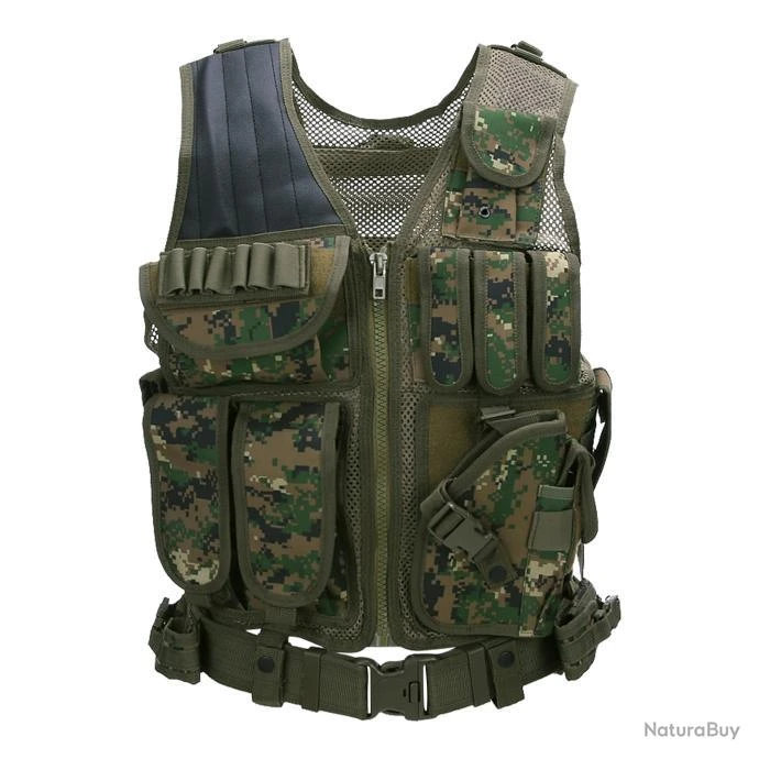 Ce gilet tactique prédator avec holster, réglable à sa taille par les sangles de chaque côté.