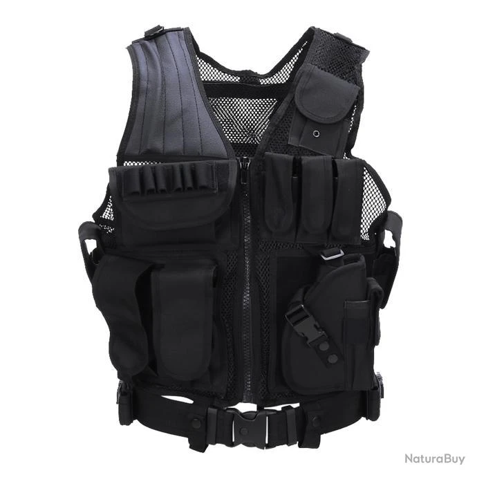 Ce gilet tactique prédator avec holster, réglable à sa taille par les sangles de chaque côté.