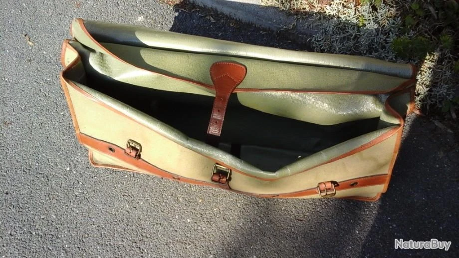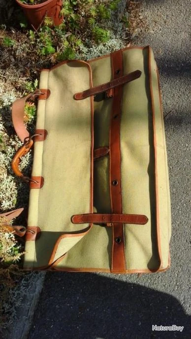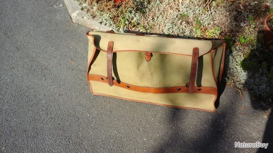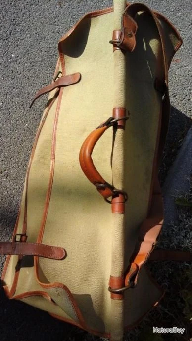 Grand sac de battue canvas et cuir tb etat doublure int impermeable 2 grandes poches de chaque cote avec rabats sangles cuir toutes les coutires et sanglrs etat neuf tres peu servi juste toile ext a raviver avec bombe mousse nettoyant tissus dimentions65x45x20