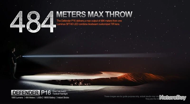 1800/700/260/50 Lumens ANSI (50s/83min/4min/8min) portée 484 mètres 58564cd