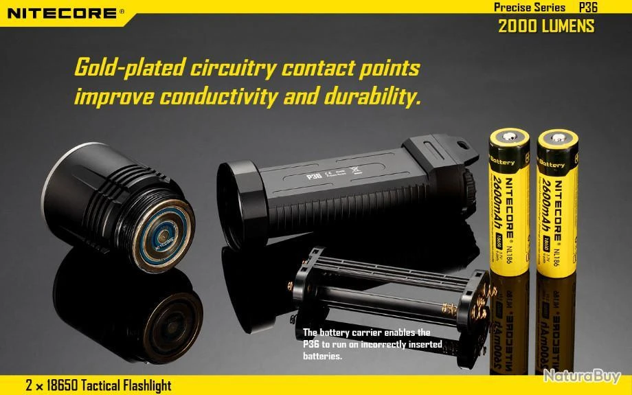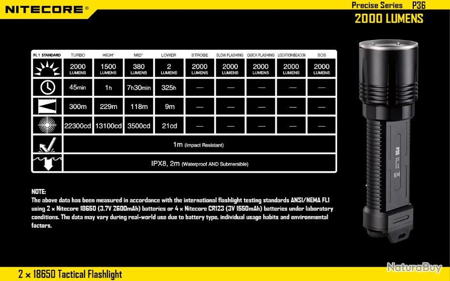 – Alimentation : 2 × 18650 ,4 × CR123 (non inclus)