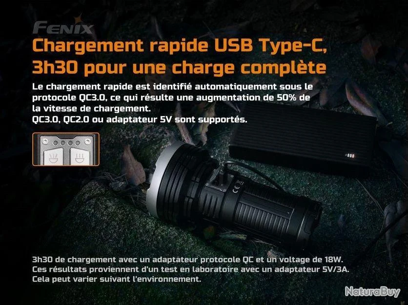 La Fenix LR40R est Ă©quipĂ©e d’une batterie Li-ion 18560 (3,6V/12000mAh) qui se recharge rapidement via le port de charge USB Type-C.