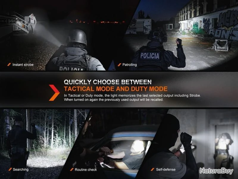 Mémorisation automatique : En mode tactique et sécurité, la lampe mémorise la dernière sortie utilisée. Lorsqu’elle est rallumée, la sortie précédemment utilisée en mode général est rappelée.