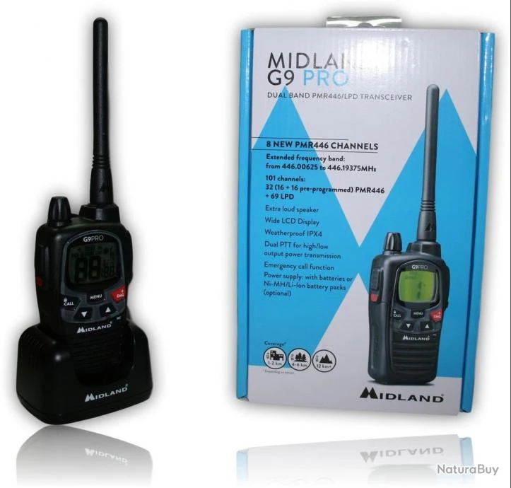 Le Midland G9 devient PRO, l’excellente radio adaptĂ©e Ă toute utilisation en extĂ©rieur. Le G9 PRO a un Ă©cran 30% plus grand et un son 30% amĂ©liorĂ© par rapport Ă la version prĂ©cĂ©dente, une antenne plus puissante et un double PTT pour sĂ©lectionner la puissance haute et basse. Une caractĂ©ristique clĂ© ? Les 8 nouveaux canaux PMR446, utilisables gratuitement dans toute l’Europe. Plus de communications surchargĂ©es sur les frĂ©quences du PMR446. Parmi les accessoires en option : le pack batterie lithium, pour une radio plus lĂ©gère et une plus grande autonomie.