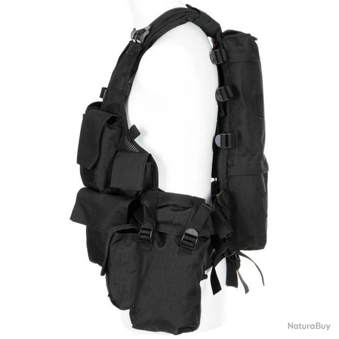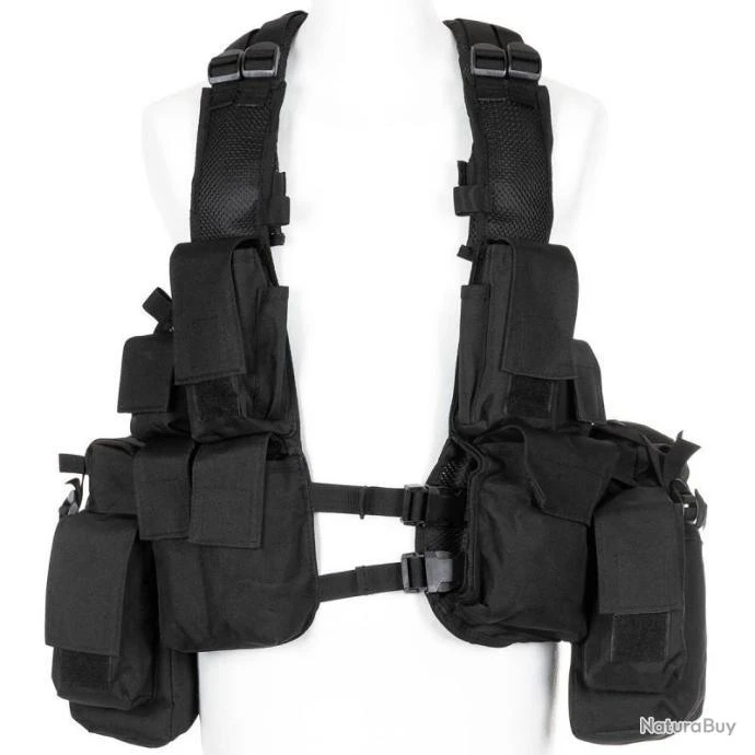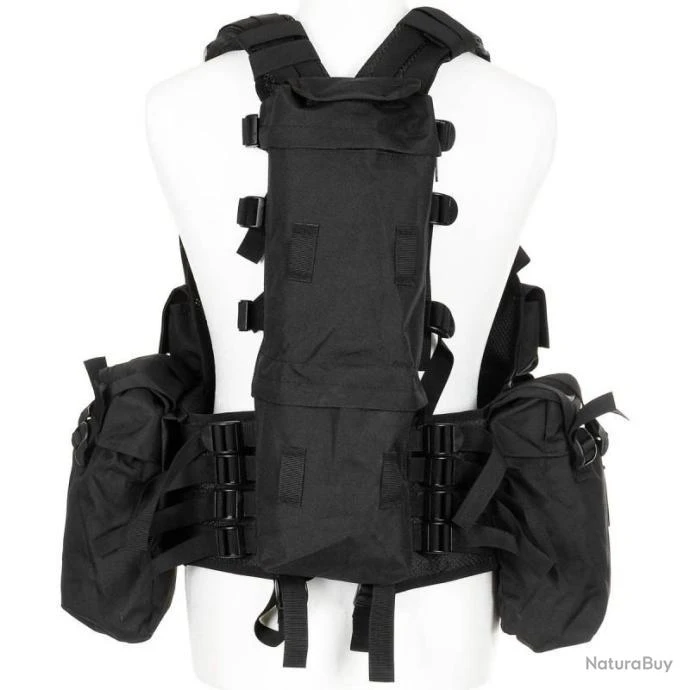 Harnais tactique de coloris noir. Taille ajustable par sangles latérales.