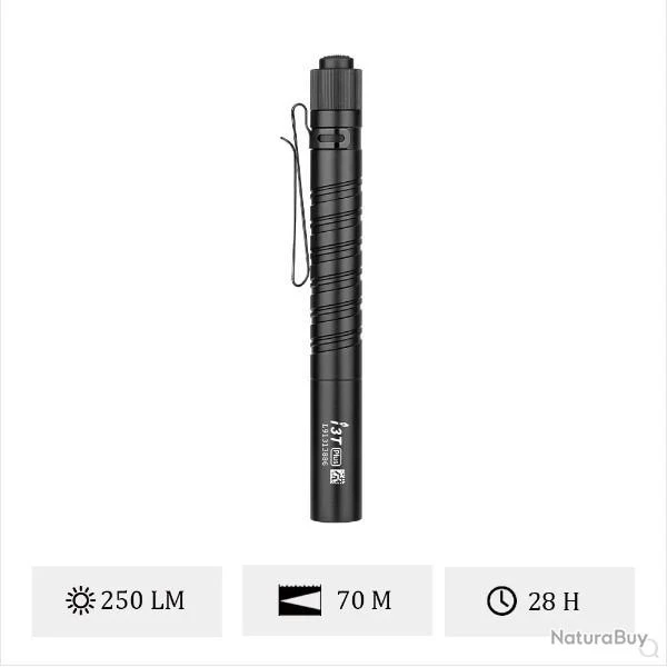 La i3T Plus est une lampe en forme de stylo EDC à interrupteur arrière alimentée par deux piles alcalines AAA. Sa LED hautes performances, associée à une lentille optique PMMA, produit un faisceau doux et équilibré avec un mode de 250 ou 15 lumens.