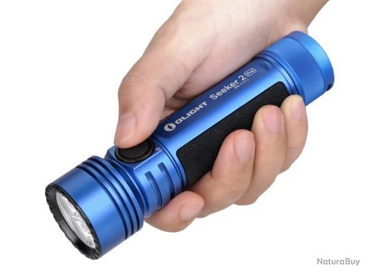 La Seeker 2 Pro est une puissante lampe torche à LED avec interrupteur latéral. Alimentée par une batterie Olight 21700 au lithium rechargeable d’une capacité maximale de 5000 mAh, cette lampe fournit une puissance maximale de 3200 lumens. Elle utilise une LED de haute qualité couplées à une lentille optique TIR, permettant un éclairage optimal à moyenne distance et courte distance. On retrouve l’interrupteur sur la partie latéral de la lampe proche de la tête donc facilement accessible doté d’un indicateur de batterie et d’intensité en 4 niveau. Le corps de la Seeker 2 Pro est habillé de rainures et de silicone antidérapant améliorant grandement la prise en main et l’ergonomie.