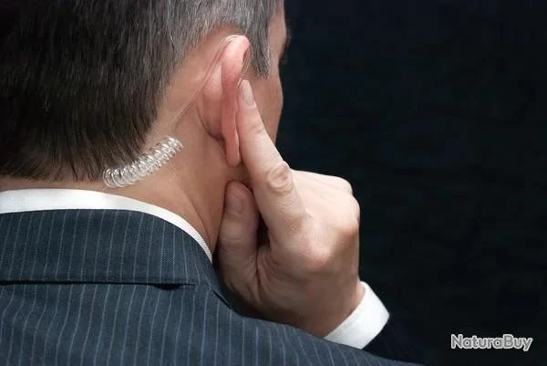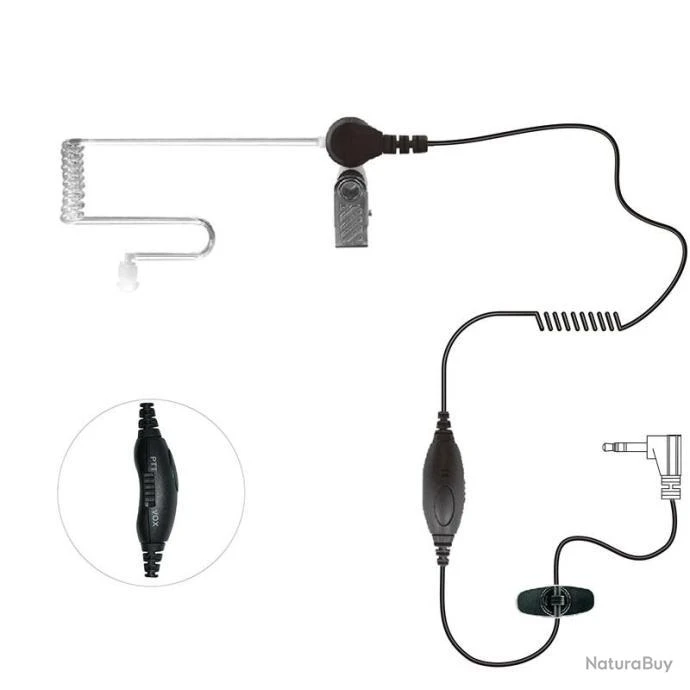 Oreillette Bodyguards. Micro cravate avec PTT et VOX qui s’accroche à hauteur du col et tube transparent souple. Aspect Bodyguards. Prise avec 1 pins (voir détails dans les photos). Il dispose d’un micros déporté avec un bouton PTT ou VOX.