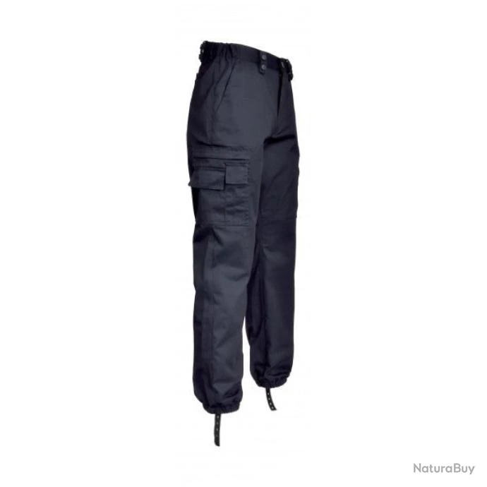 Poche latérale gauche zippée, taille élastiquée, crans de ceinture avec boutons pression, bas élastiqués, élastique réglable sous pied pour maintien du pantalon, déperlant. »/