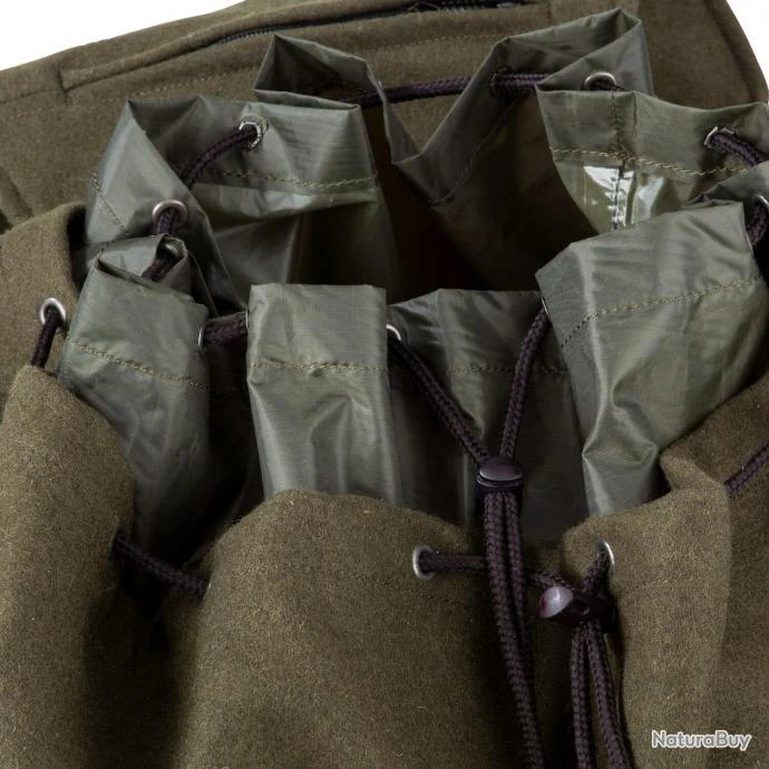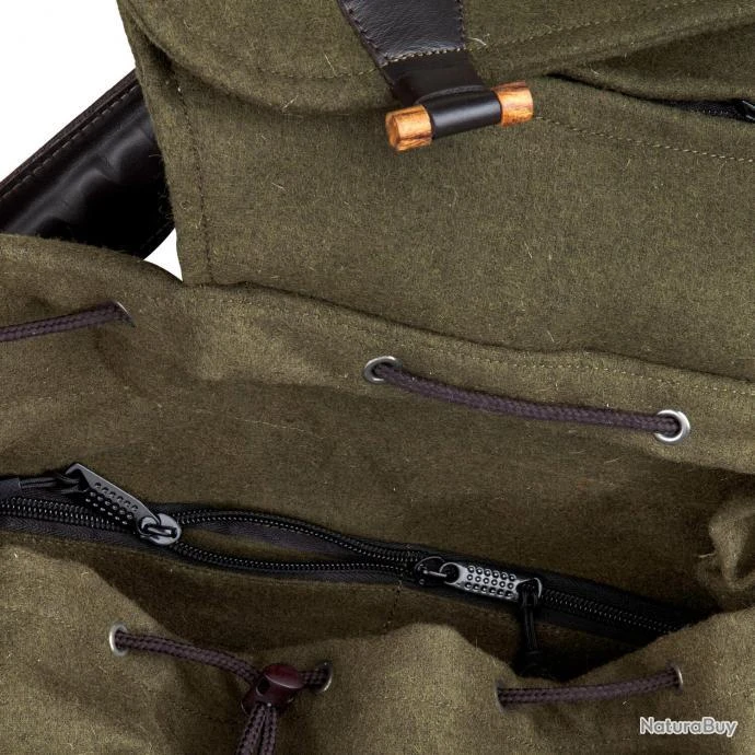 Sac à dos silencieux en loden résistant. Avec deux poches avec fermeture éclair (17×21 cm) intérieur, une avec couvercle (17×23 cm) et deux poches avec rabat empiècées avec fermetures en bois type «brandebourgs».