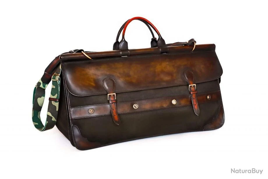 « Le Pionnier » affiche une emprunte de cerf sur la patte de la fermeture et son rabat peut se personnaliser avec un motif de trophée de chasse marqué à chaud, au choix parmi le cerf, la bécasse ou le koudou.