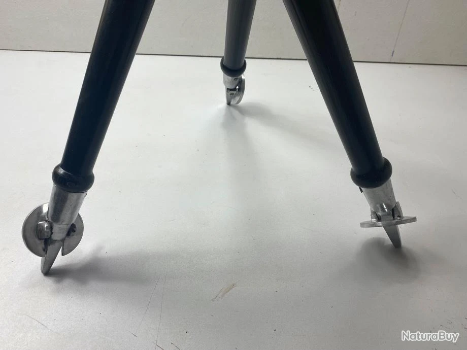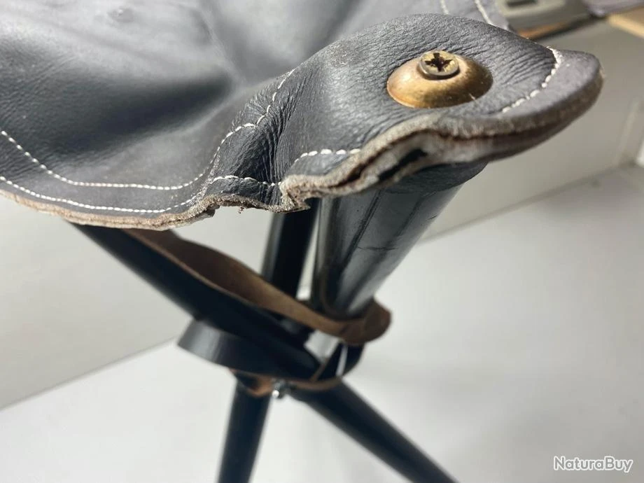 Siège trepied pliant en cuir, bois et plieds en aluminium.