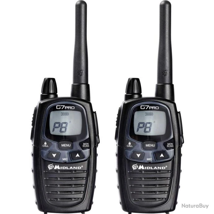 Pack de 2 G7 Pro avec double chargeur et clips ceinture Version bi-puissance avec bouton d’appel classique et boost Radio sans licence bi-bande PMR446 et LPD Afficheur LCD rétro éclairé maximisant le confort d’utilisation Haut-parleur renforcé, puissant et haute qualité « Clear vox » Autonomie : 18h max avec pack batterie 1800 mAh Fonction vox : déclenchement automatique à la voix Économiseur de batterie automatique Test de portée OfficeEasy : 7/10 Produit original avec garantie 3 ans Midland France