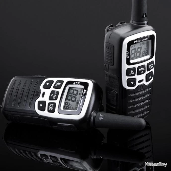 Nouvelle gamme longue portée Midland Pack complet en Mallette: chargeur, clips ceinture et Oreillettes 100% compatible avec les autres midland (g9, g10, g7 etc) Recharge via cable USB ou chargeur de bureau (fourni) Fonction Mains libres Vox Coque durcie polycarbonates ultra résistants 24 canaux (8 + 16 sous canaux) Verrouillage clavier