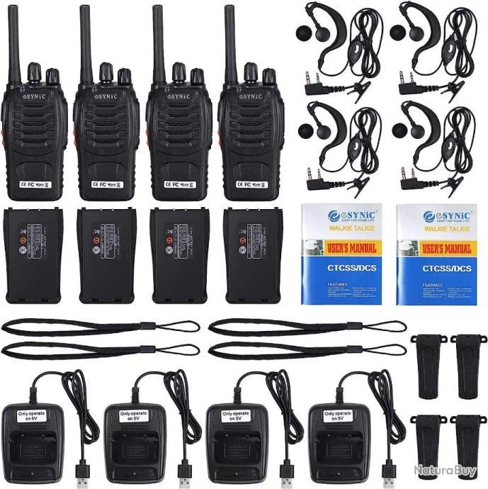 Talkie Walkie 4pcs Rechargeable 16 Canaux VOX LCD Batterie 1500 mAh Lampe Oreillette et USB