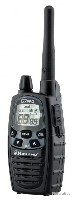 Description : Le Midland G7 intègre toutes les fonctions classique des talkies de la marque.Portatif bi-bandes LPD/PMR.38 tons CTCSS en TX et RX.Bouton d’appel avec 5 tons paramétrables.Fonction Vibracall (vibr