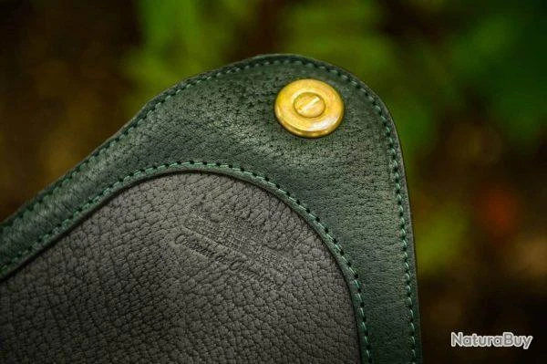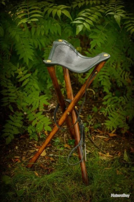 Siège de battue avec assise triangulaire en cuir de cerf de Chambord , et bretelle en cuir. Pieds en bois de hêtre. Croisillon développé spécialement par Alexandre Mareuil en 2008, qui supporte jusqu’à 150 kg.